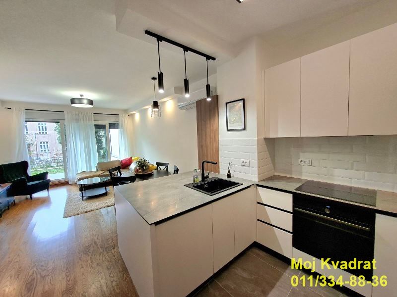 Kompletno je opremljen i sastoji se od dnevnog boravka koji izlazi na terasu i zasebno dvorište, trpezarije, kuhinje, dve spavaće sobe od kojih jedna ima veliki garderober (walk-in), kupatila i toaleta.