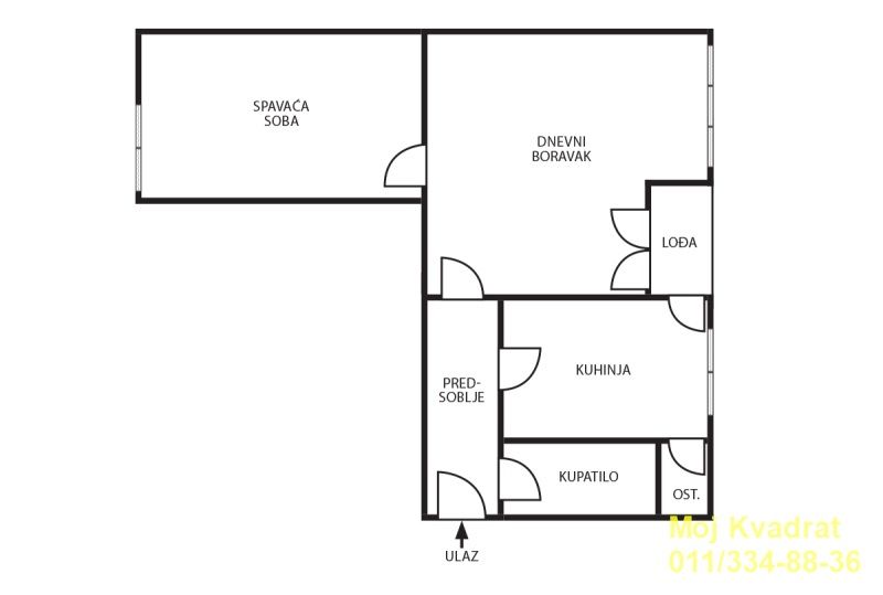 Prostorije: hodnik, kupatilo, kuhinja sa trpezarijom i ostavom, veliki dnevni boravak sa izlazom na lođu, spavaća soba.