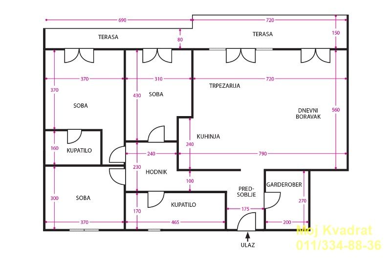 Raspored prostorija: predsoblje, hodnik, prostran dnevni boravak povezan sa trpezarijom i kuhinjom, tri spavaće sobe, dva moderno opremljena kupatila, posebna prostorija za garderober/cipelarnik i velika terasa koja daje poseban osećaj otvorenosti i privatnosti.
