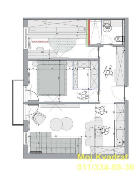Stan ima dnevni boravak – open space iz kog se izlazi na terasu, dve spavaće sobe, kupatilo i hodnik. Pri opremanju stana su korišćeni najluksuzniji brendovi. Nameštaj, oprema i uređaji su izvanrednog kvaliteta i dizajna.